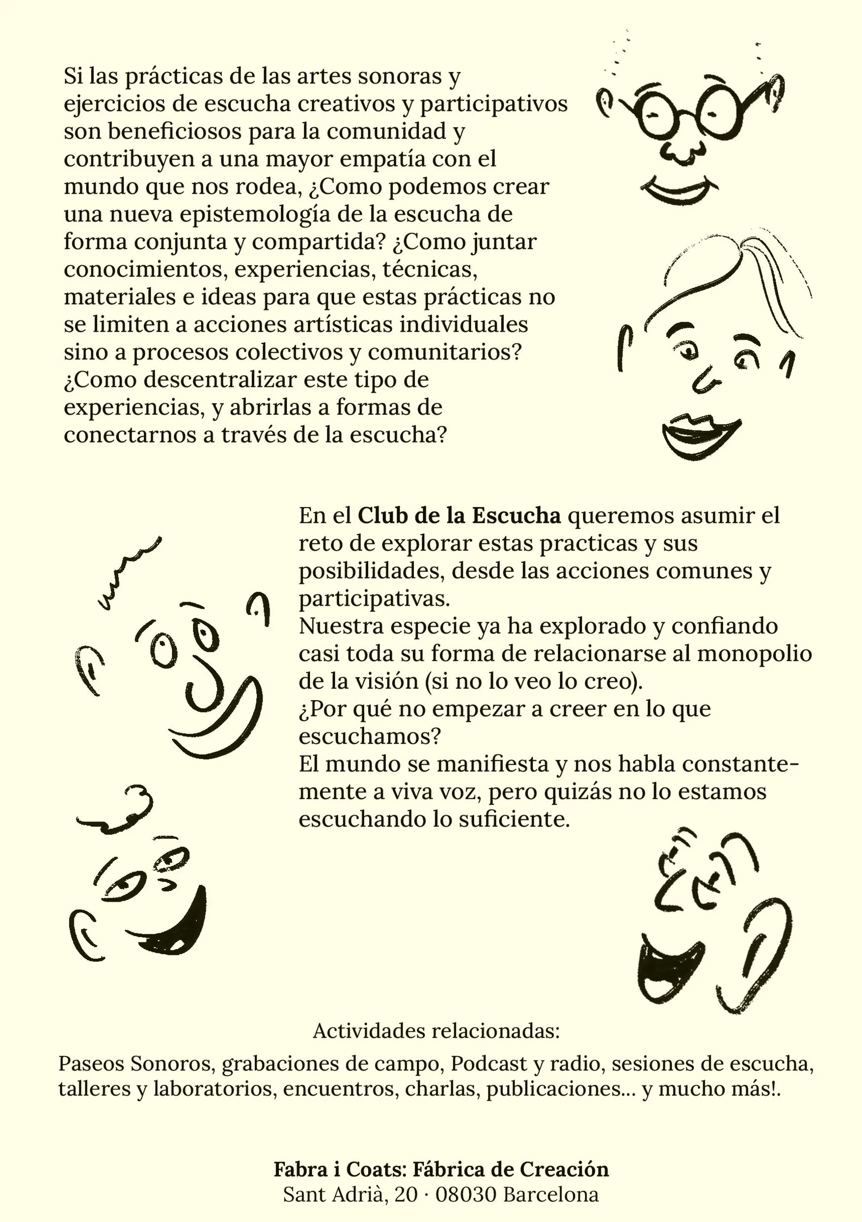 I first proposed the idea for the Club to the Fabra i Coats Center in Barcelona, where I was an artist in residence. This institutional Art Creation Center is a huge factory space that hosts more than 70 artists from different disciplines, including contemporary art, music, dance, theater, etc. The idea was very well received and, in addition to starting the Club, I was commissioned to devise a series of activities related to listening practices that would serve as a bridge between artists, the neighborhood, social groups, and educational centers.